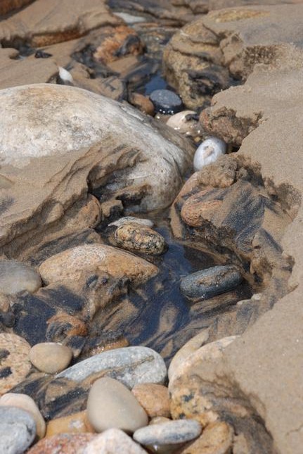 As a tidal pond empties, it erodes its own miniature Grand Canyon leaving you to discover sand mixed with the carbon deposited by mil lena of vegetation growth in the boggy ponds.